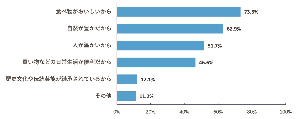 「今住んでいる地域は好きですか?」という設問に対して「はい」(62.4%)が最も高く、理由は「食べ物がおいしいから」(73.3%)が最も高く、「いいえ」と回答した人の理由では「若者の遊ぶ場所がないから」(100%)が最も高い結果となりました。