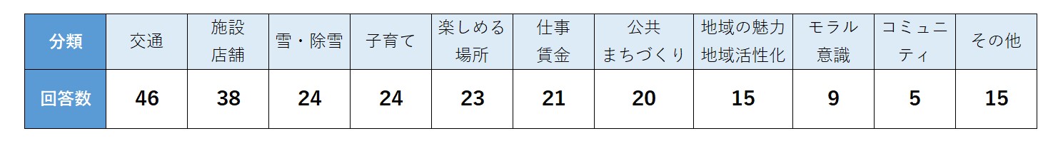 - 若者が帰ってきたいと思える場所にして欲しい。少子高齢化が進み、都会に行けば帰ってこない。便利だから。