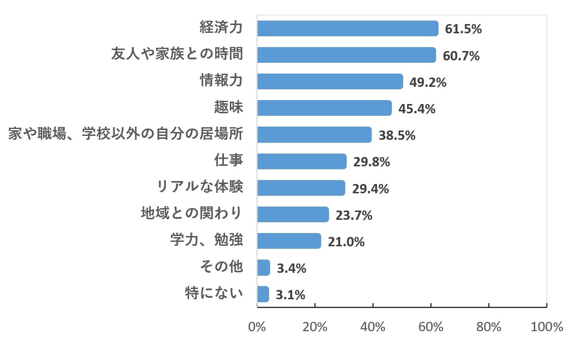新型コロナウイルス感染症の影響についての設問では、「あった」と回答した人は68.3%と過半数を占めました。新型コロナウイルス感染症の流行や自粛により以前より「大切だ」と思うようになったことについては、「経済力」(61.5%)と「友人や家族との時間」(60.7%)の割合が高く、次いで「情報力」(49.5%)、「趣味」(45.4%)という結果となりました。