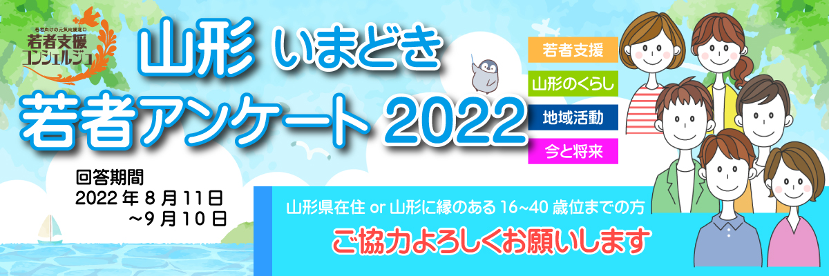 山形いまどき若者アンケート2022 アンケート回答期間は終了しました。 ご協力をありがとうござまいました。 16歳~40歳位までの山形県に縁のある方々を対象に、 アンケートを実施します! あなたの声を、ぜひ私たちに届けてください。 ★調査結果は「おこしあいネット」で公表し、 これからの若者支援コンシェルジュ事業の参考とさせていただきます。 調査期間 令和4年8月11日~令和4年9月10日 調査対象 山形県に在住または縁のある16歳から40歳くらいまでの方 調査実施機関 若者支援コンシェルジュ事務局(委託元:山形県)