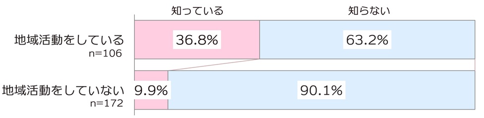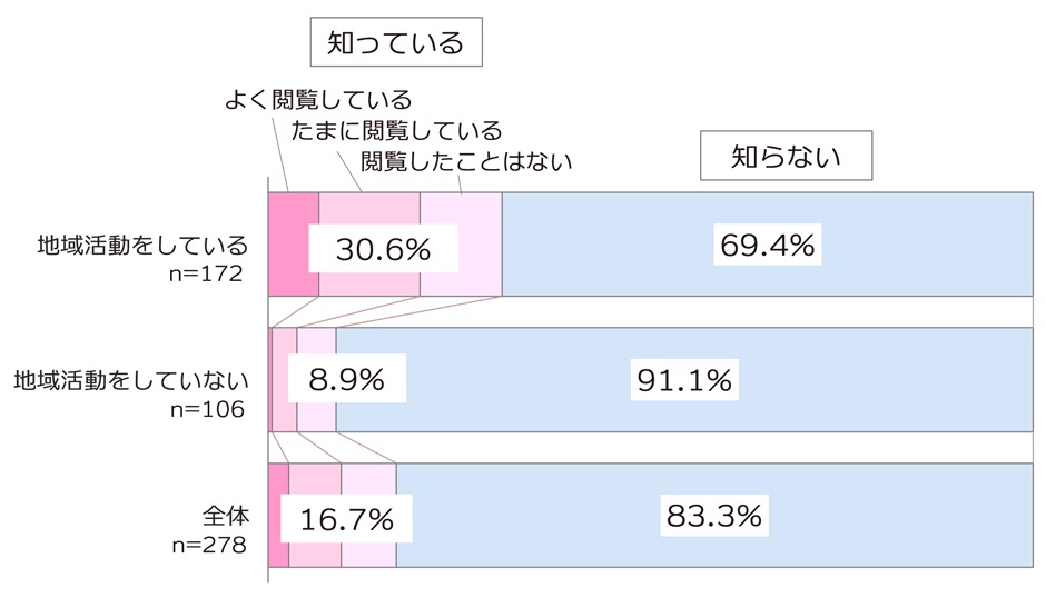 問18で「やまカツ!」の認知度を尋ねたところ、全体では「知っている」(よく閲覧している・たまに閲覧している・閲覧したことはないの合算)は16.7%となり、地域活動の有無別でみると、地域活動をしている人では「知っている」は30.6%、していない人では8.9%となりました。