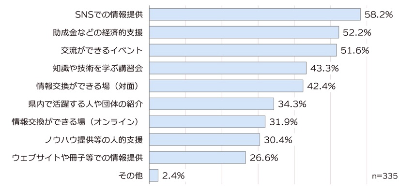 問19では、若者の地域活動を応援するためにあるとよい取り組みを尋ねました。その結果、「SNSでの情報提供」(58.2%)が最も高く、次いで「助成金などの経済的支援」(52.2%)、3番目に「交流ができるイベント」(51.6%)となりました。