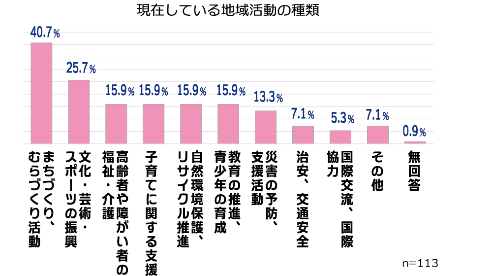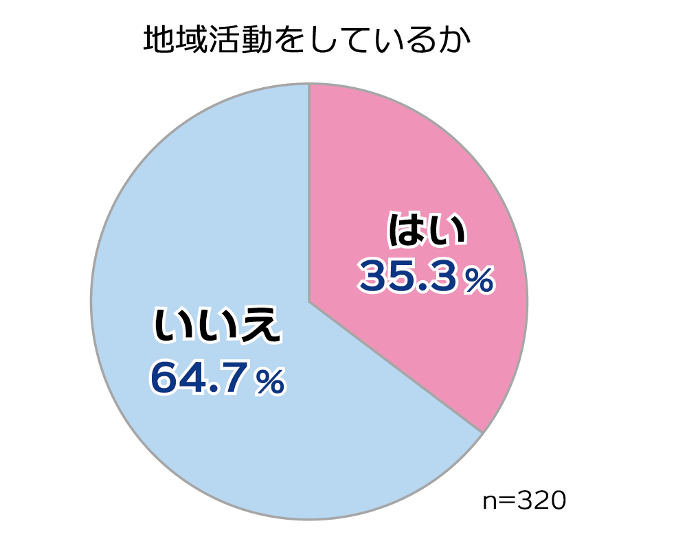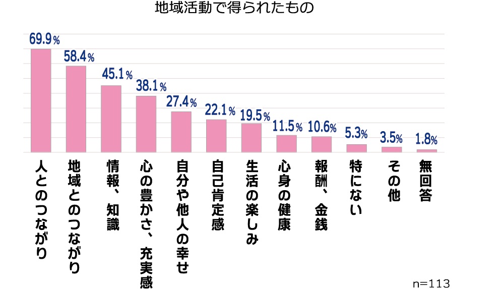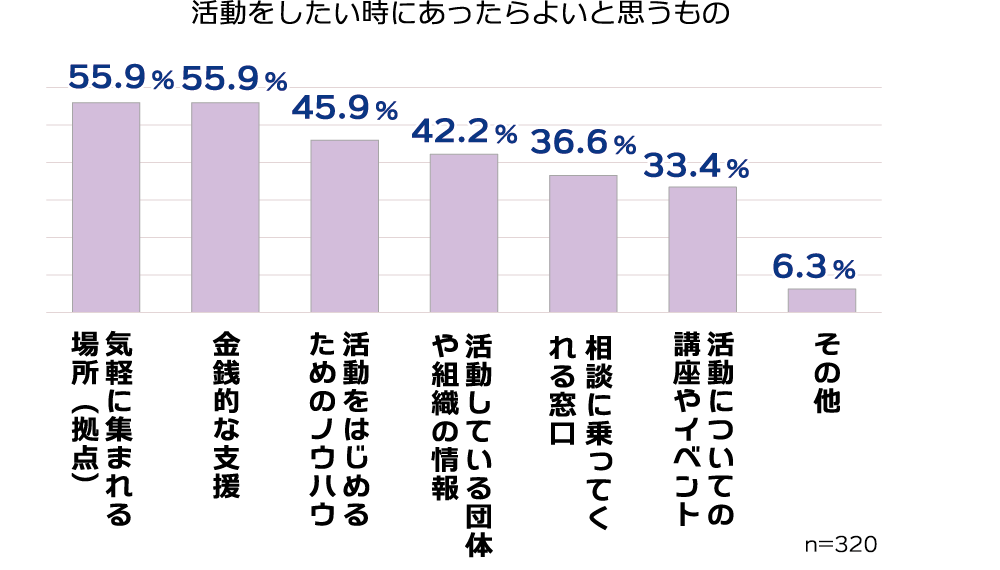 回答者のうち「地域活動をしている」と答えた割合は35.3%にとどまりました。行っている活動としては、「まちづくり、むらづくり活動」が最も多く、活動を通して得たものは「人とのつながり」が最も多く、次点で「地域とのつながり」となりました。あったら良いものは「気軽に集まれる場所」「金銭的な支援」が同列の55.9%で、場所とお金が課題のひとつになっていることがうかがえました。